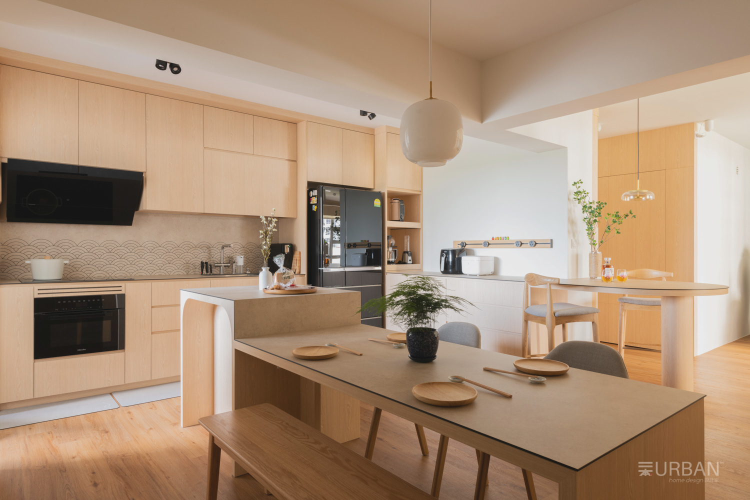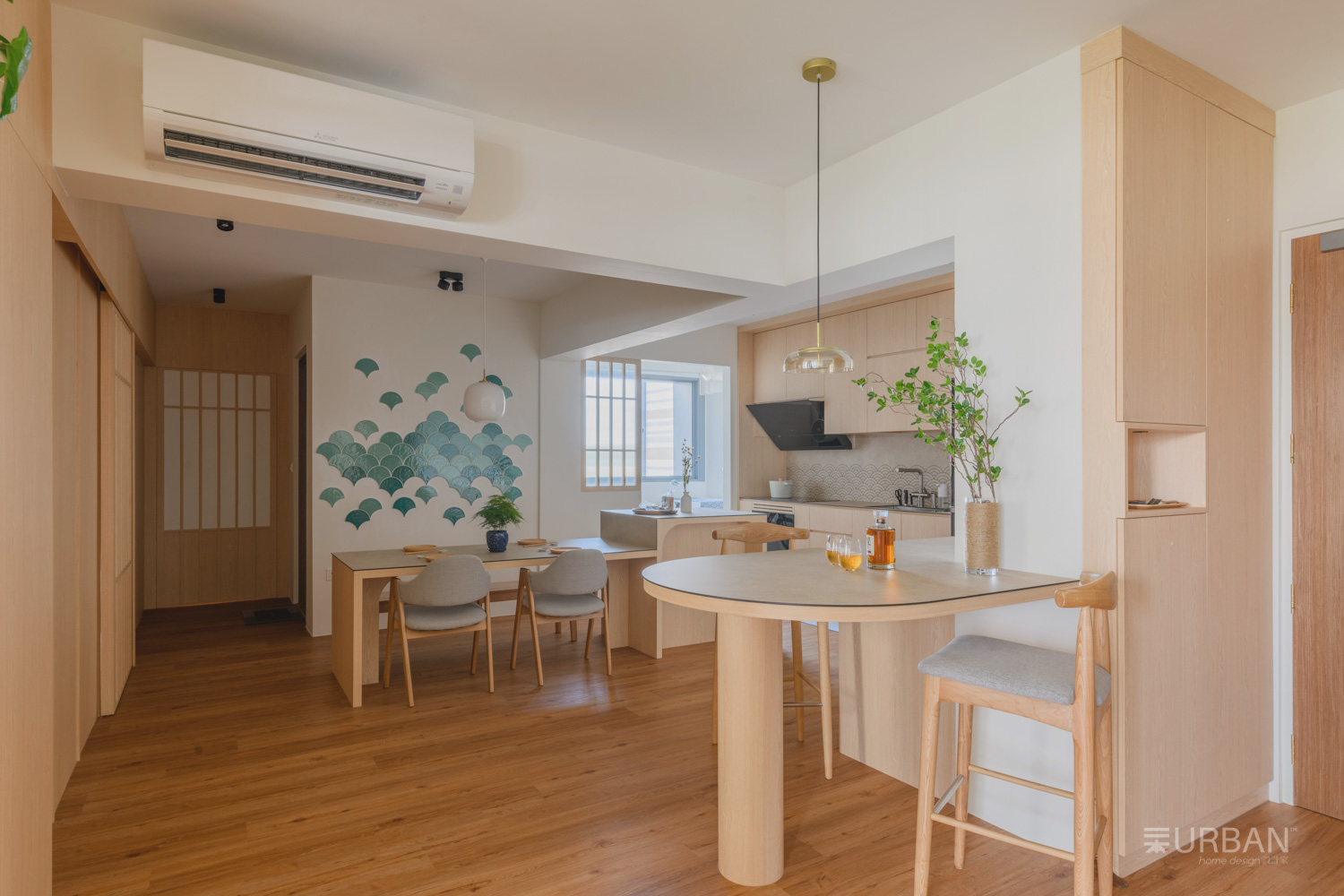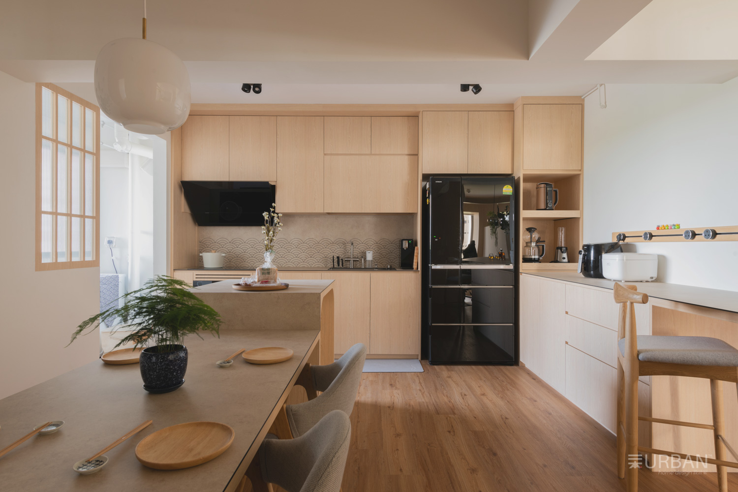 This 5-room HDB is Japanese Ryokan-inspired. The house is mainly made up of a combination of neutral light wood tones, styled with different green plants to give the space a sense of simplicity, tranquillity, and a strong connection to nature.