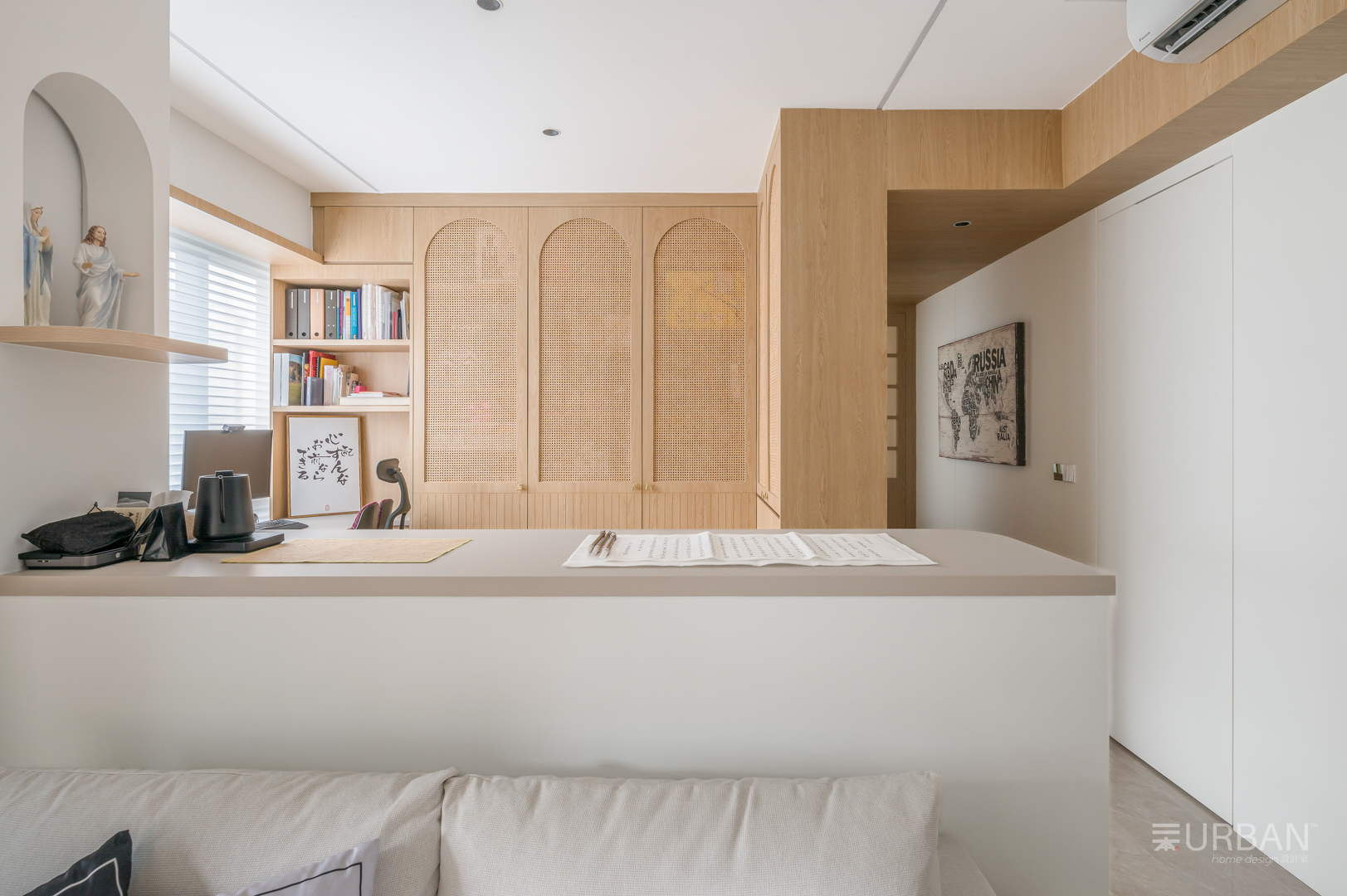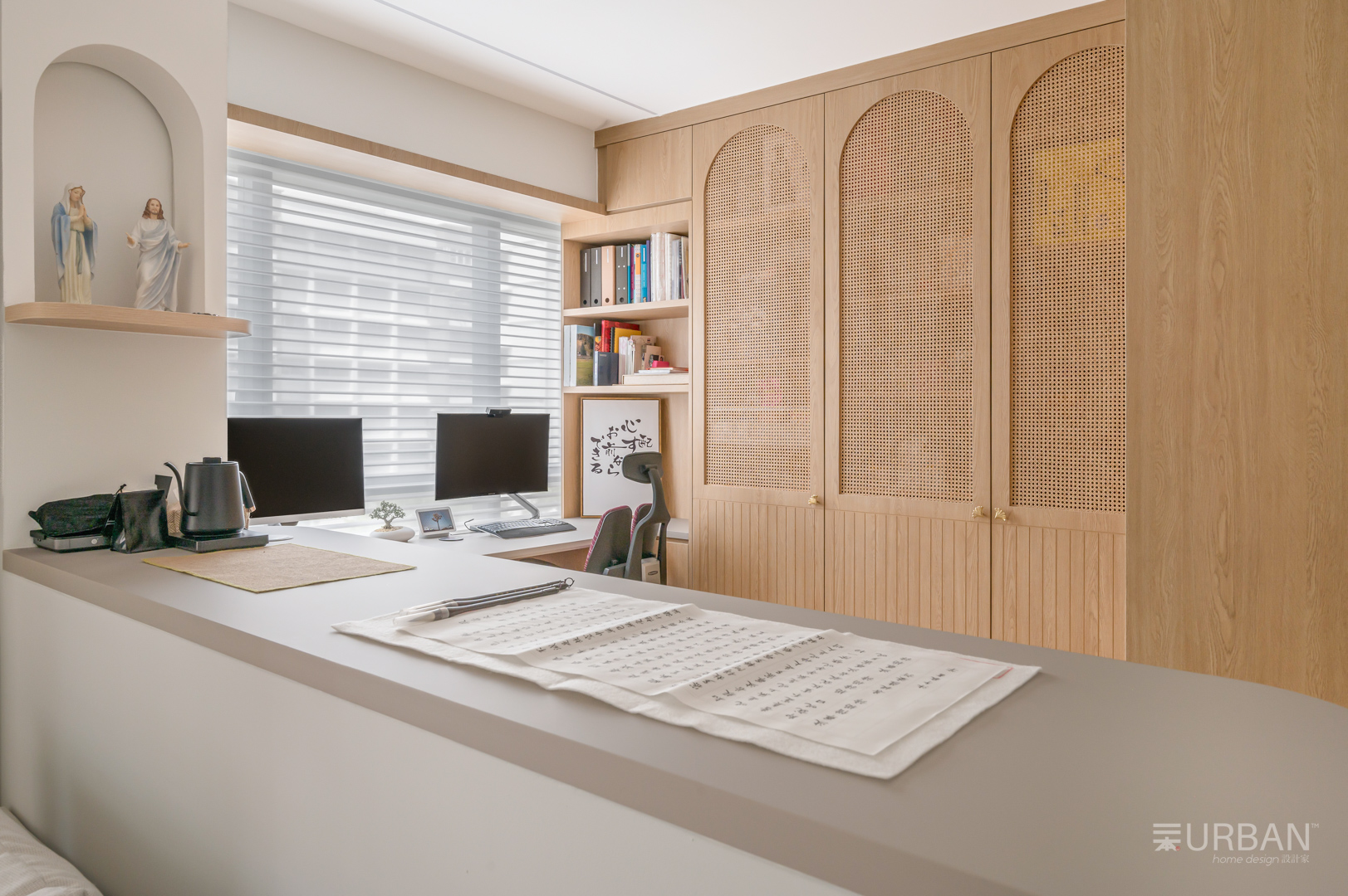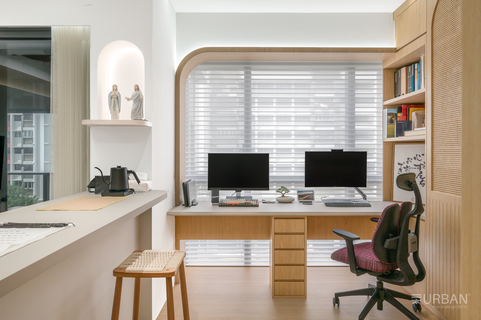 The play of LED lighting in the house is consistent with the lighting of religious figures in the home, where unconventionally different religions take stages harmoniously.The wall of bedroom 3 was removed to allow a workspace that is connected to the iving room. This encourages interaction in the era of frequent work-from-home. The table separating the living and study not nly serves as a place for study or calligraphy, but a multifunctional space where the homeowners can have a meal while watching TV.