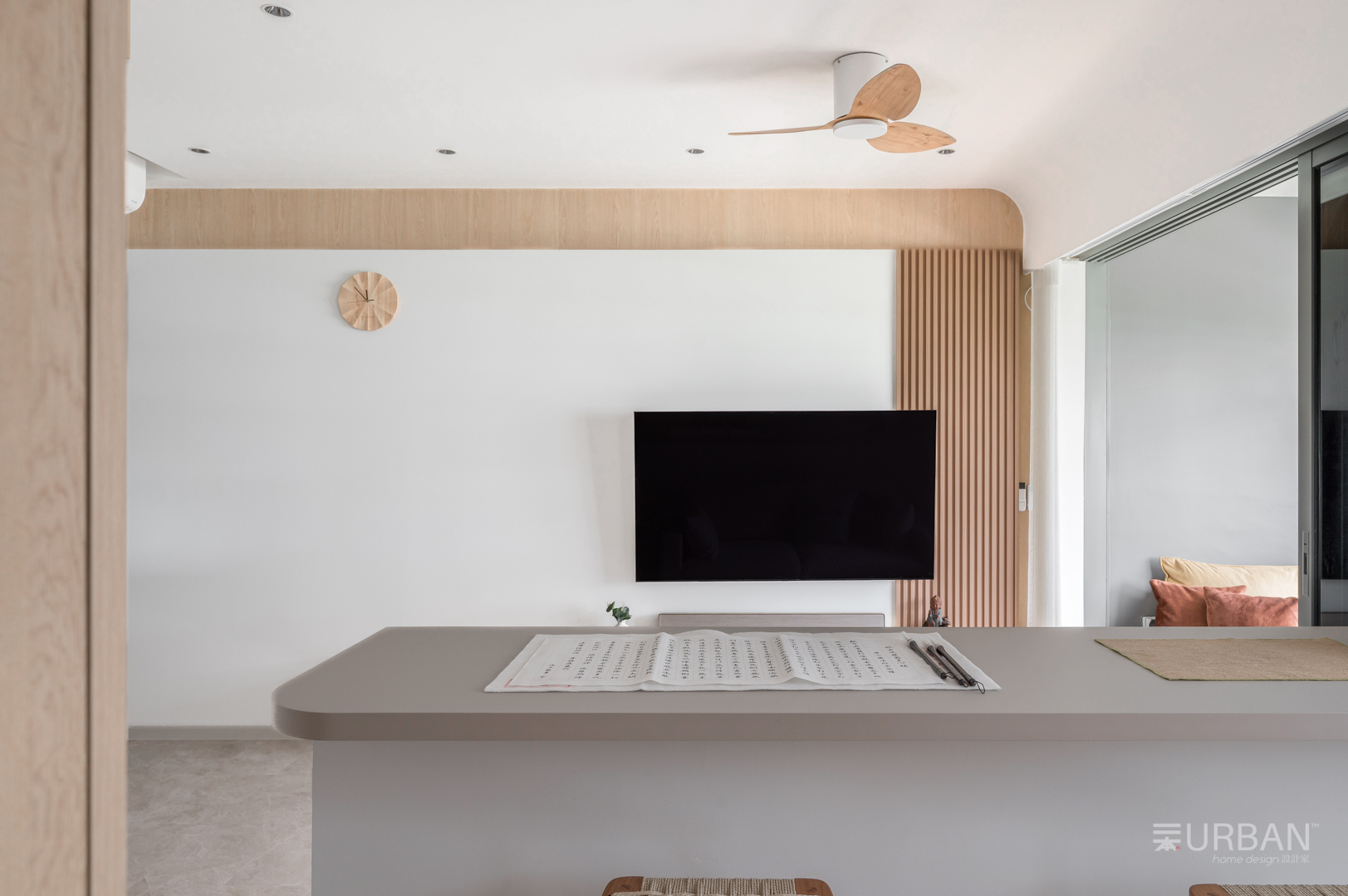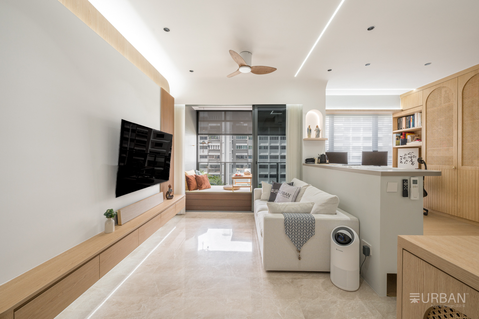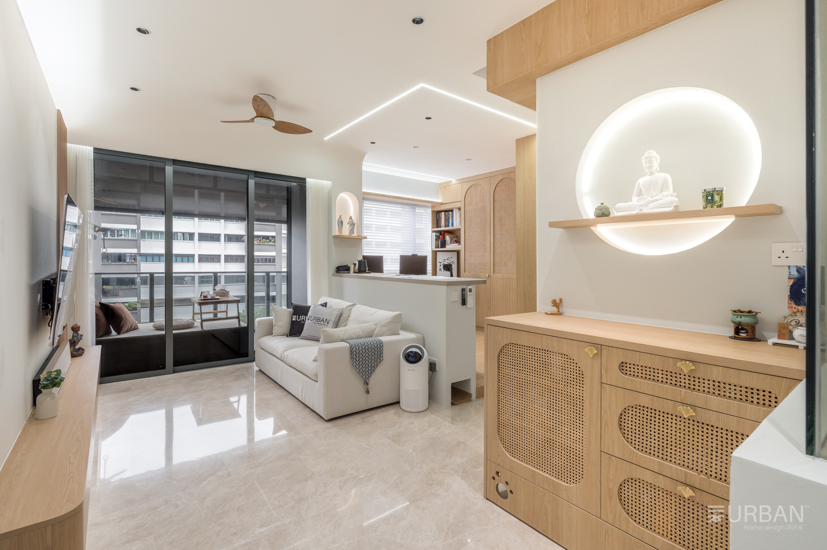 The play of LED lighting in the house is consistent with the lighting of religious figures in the home, where unconventionally different religions take stages harmoniously.The wall of bedroom 3 was removed to allow a workspace that is connected to the iving room. This encourages interaction in the era of frequent work-from-home. The table separating the living and study not nly serves as a place for study or calligraphy, but a multifunctional space where the homeowners can have a meal while watching TV.