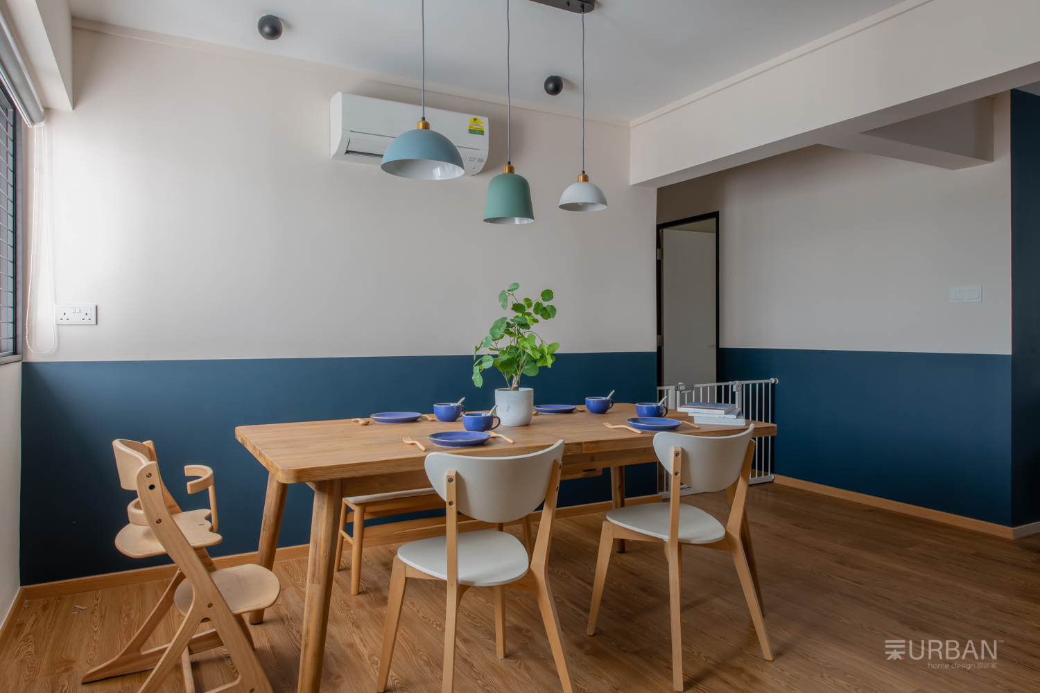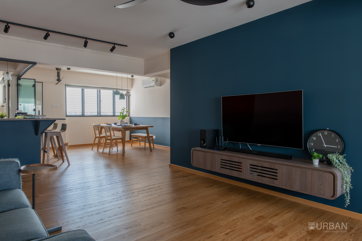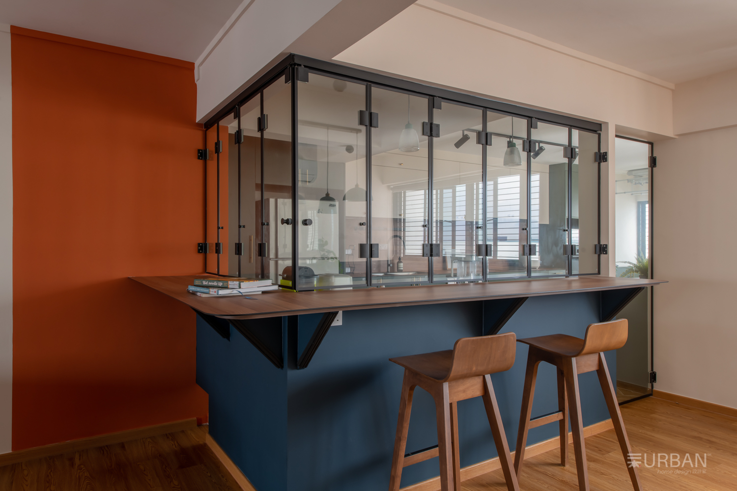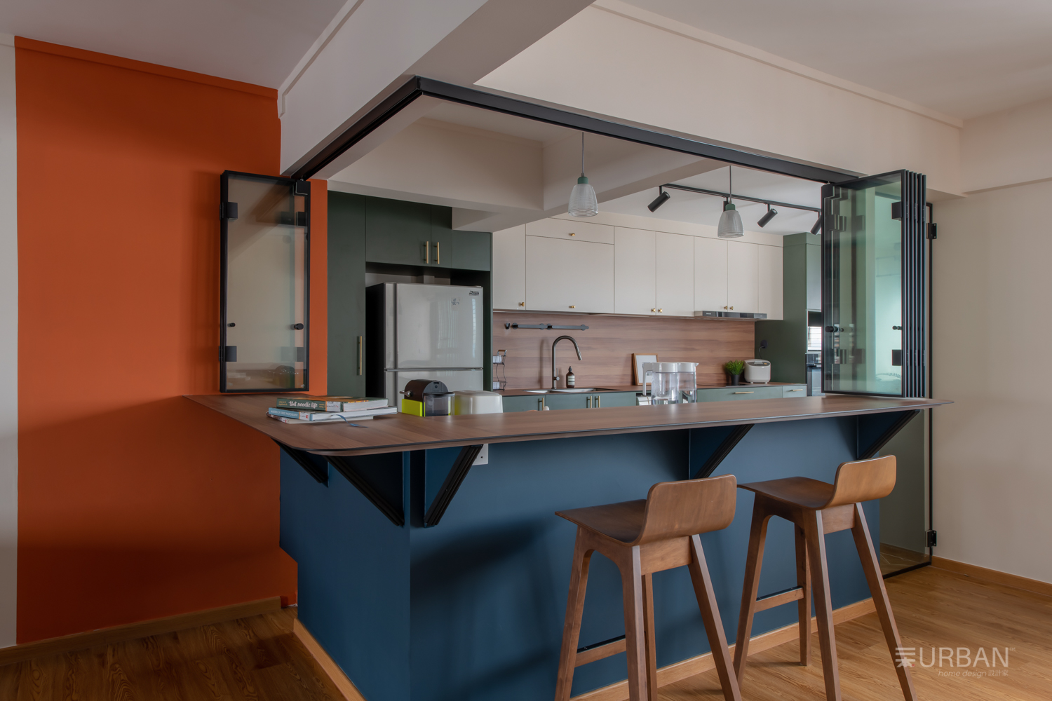 The kitchen features a foldable sliding glass partition that offers the flexibility to open up or enclose the kitchen as needed. Inside, we paired white upper cabinets with forest green base units and a wood-textured backsplash, bringing in both contrast and warmth. The navy kitchen peninsula serves as a casual bar and social hub, visually connecting the kitchen to the rest of the living space while offering extra prep or dining space.