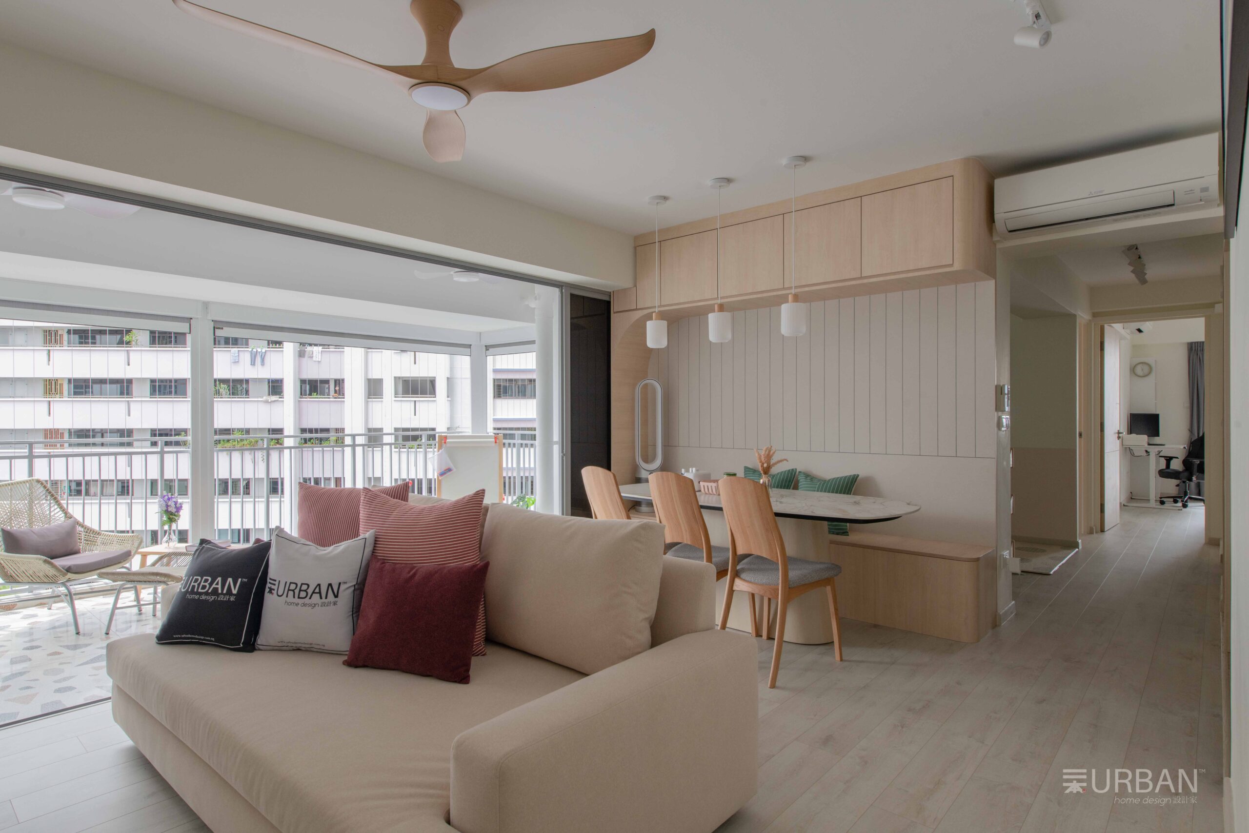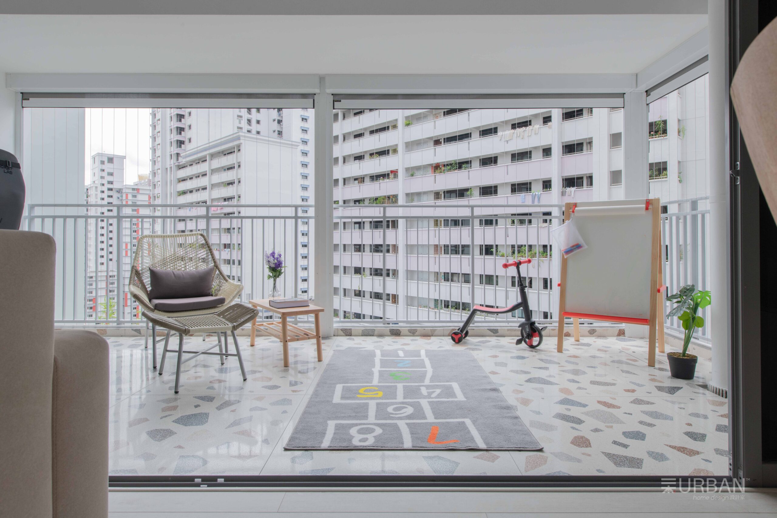 Large glass doors open out to the balcony, letting in plenty of natural light and enhancing the sense of openness. With terrazzo flooring and simple, stylish furniture, the balcony serves as a peaceful, sunlit extension of the living area.