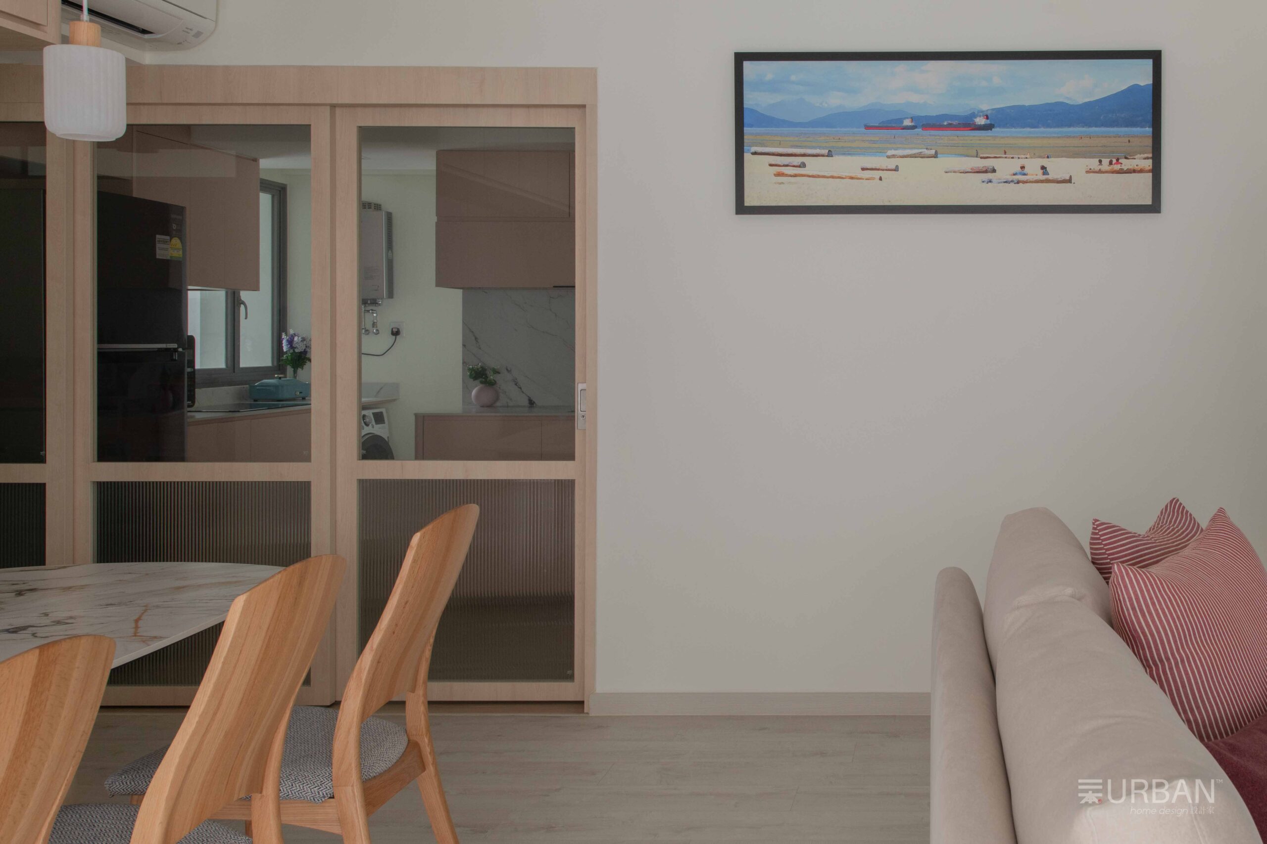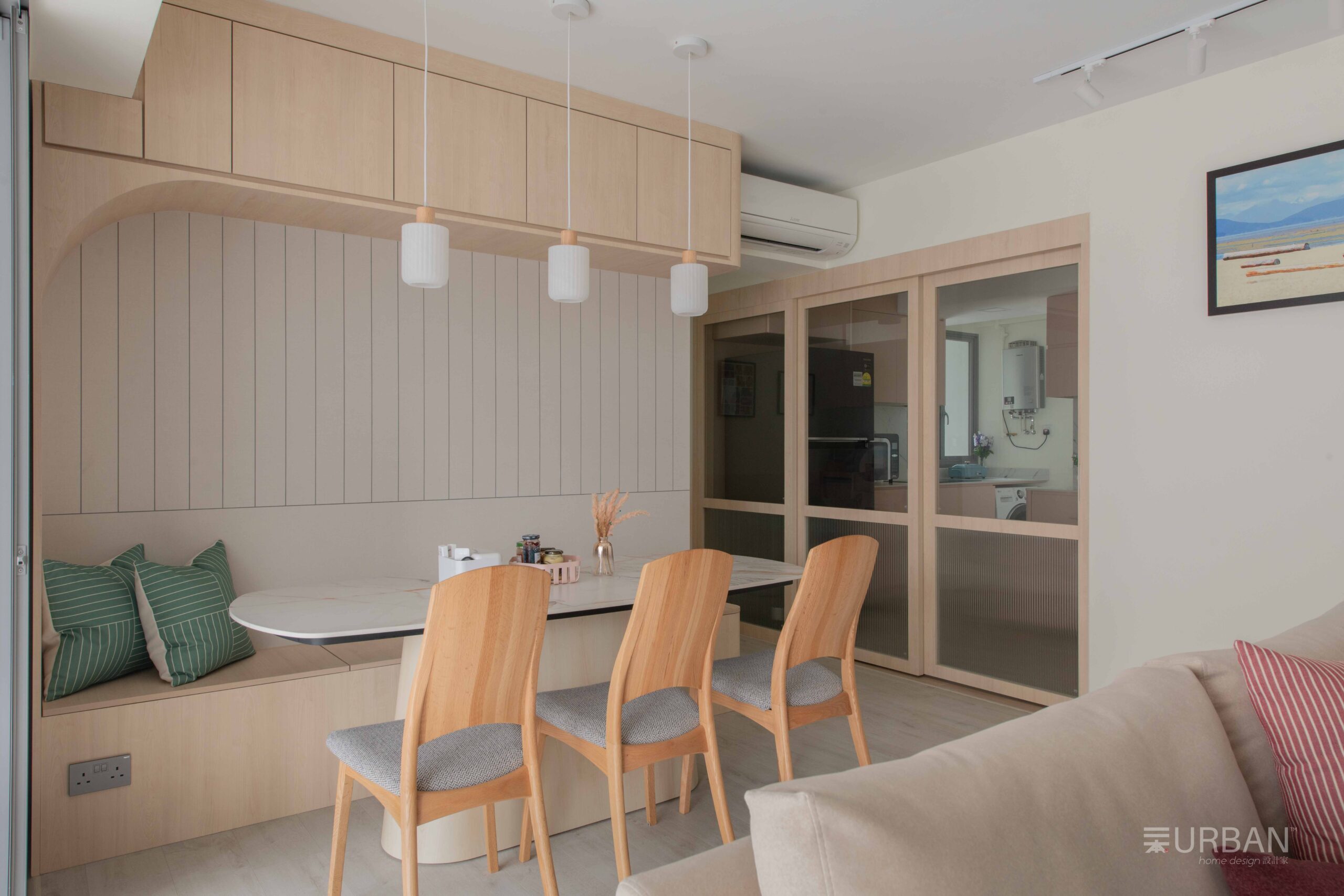 In the living room, a neutral sofa and wooden dining set create a warm, relaxed atmosphere. Vertical wood paneling adds subtle texture, while built-in cabinets offer practical storage without interrupting the clean lines. It’s a cozy, well-balanced space that feels both lived-in and refined.
