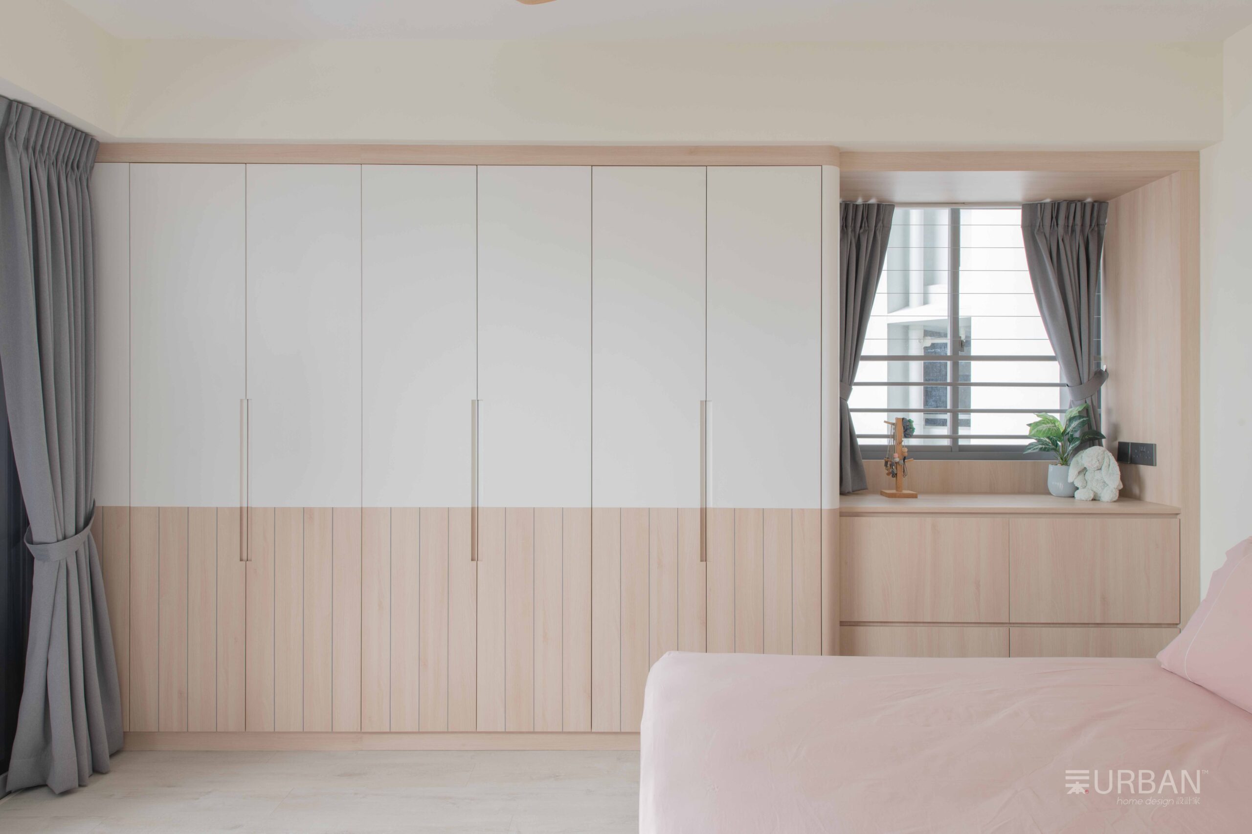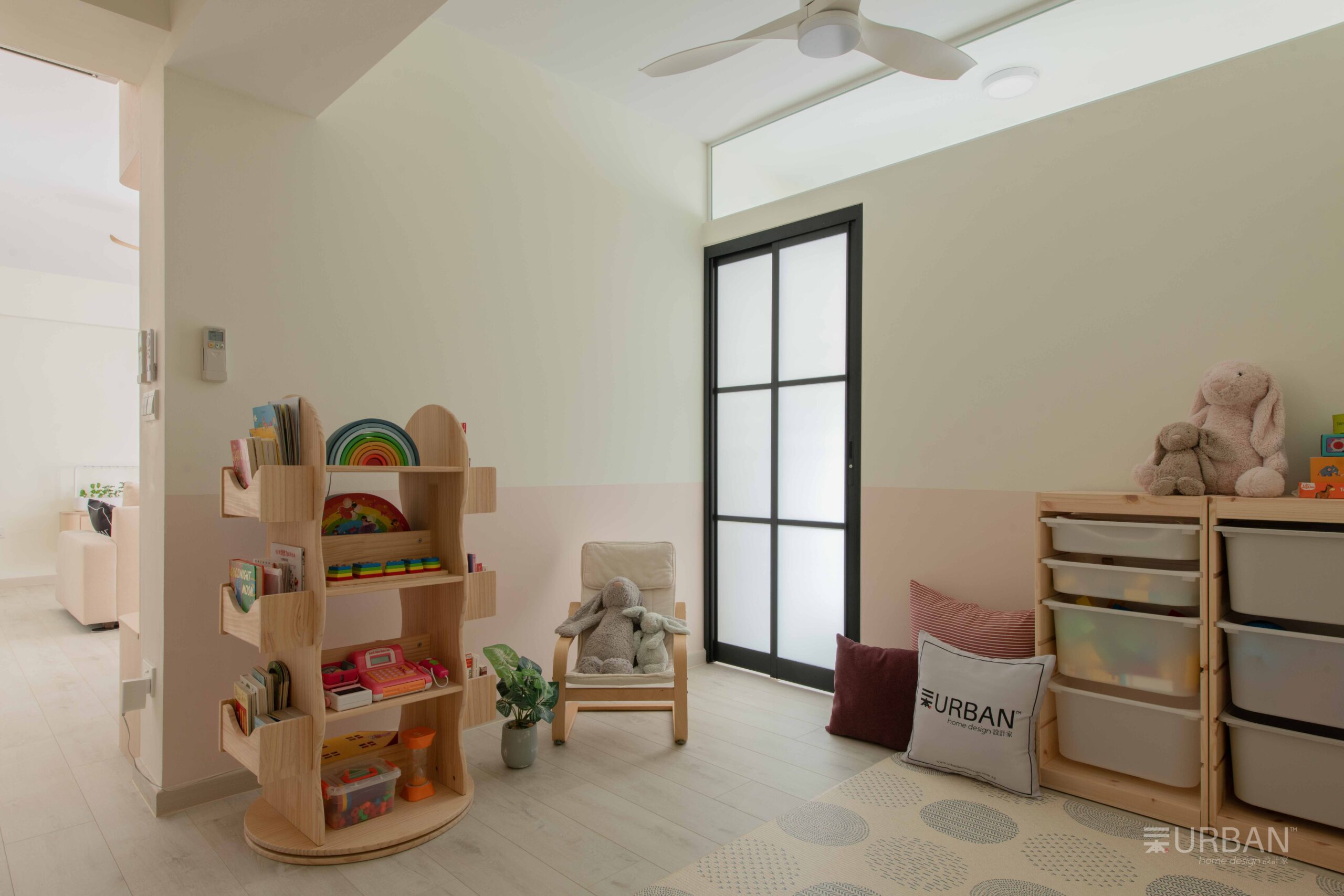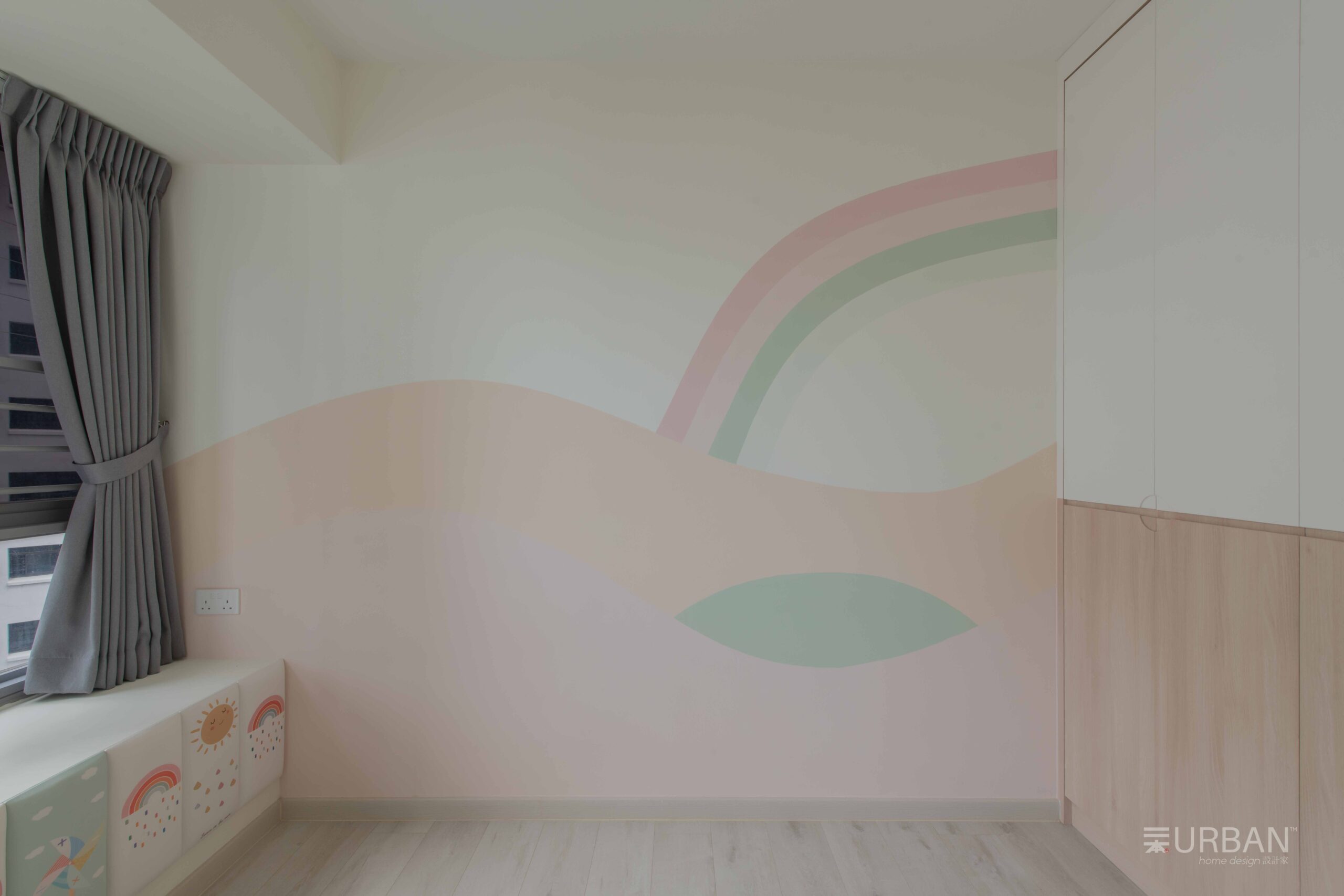 The kid’s room blends playfulness with practicality. A soft pastel mural adds character without overwhelming the space, and low open shelves support independence and easy organization. The minimal decor keeps it safe, functional, and visually clean.