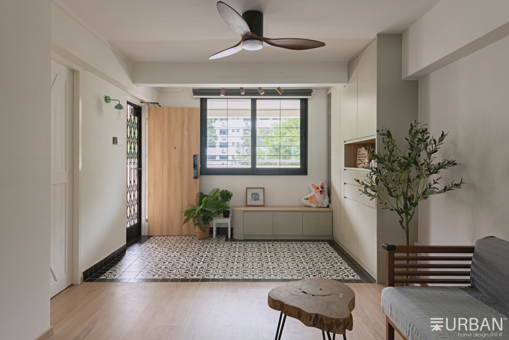 The entryway features bold black-and-white patterned tiles that define the space and create a striking contrast against the wood flooring. A small sitting area directly in front of the main door provides a practical spot to sit and put on shoes.