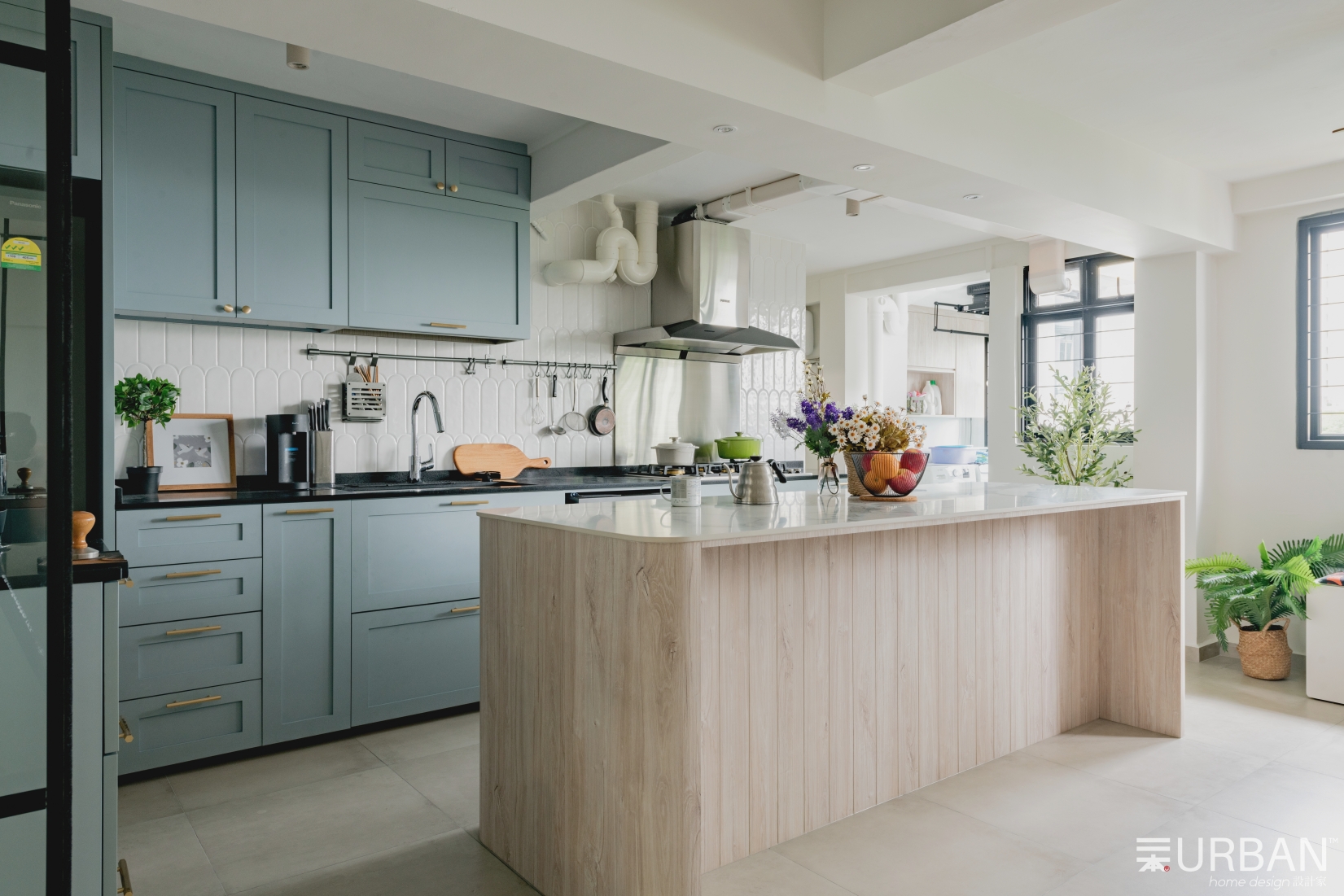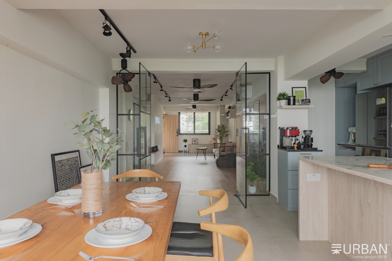 The color palette used are soft, muted tones—white, light wood, pale green, pastel blue, and hints of black for contrast. Glass doors were used to separate spaces within living room, dining and kitchen , enhancing the natural light and maintaining an open, airy feel throughout.