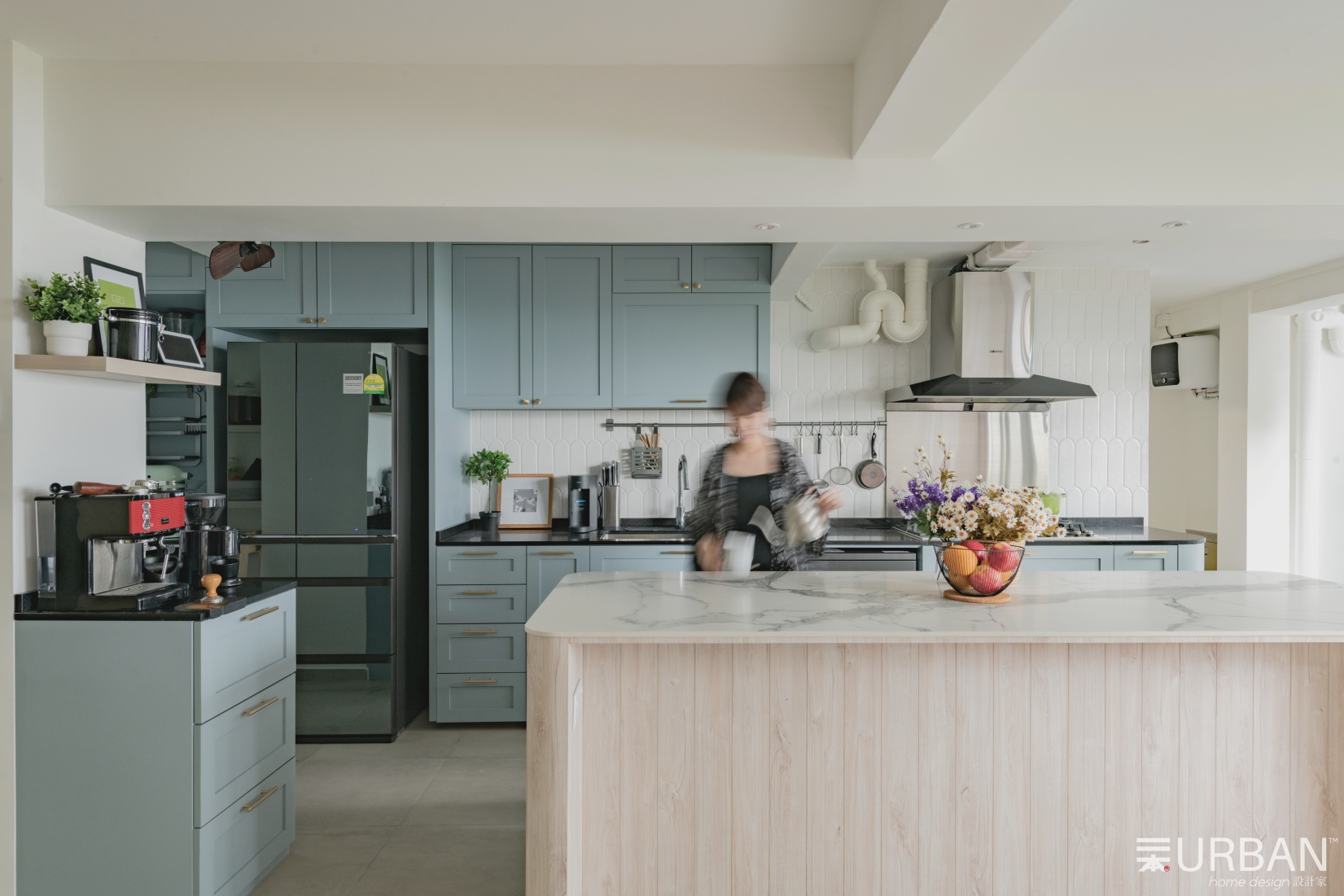 The kitchen is connected to the dining and living areas through a set of black-framed glass doors, allowing light to flow freely while still offering some separation when needed. The kitchen itself features a calming blue cabinetry paired with a light wood island. The design allows ample storage and workspace with wall mounted cabinets. The materials are practical yet stylish, keeping with the beauty in simplicity.