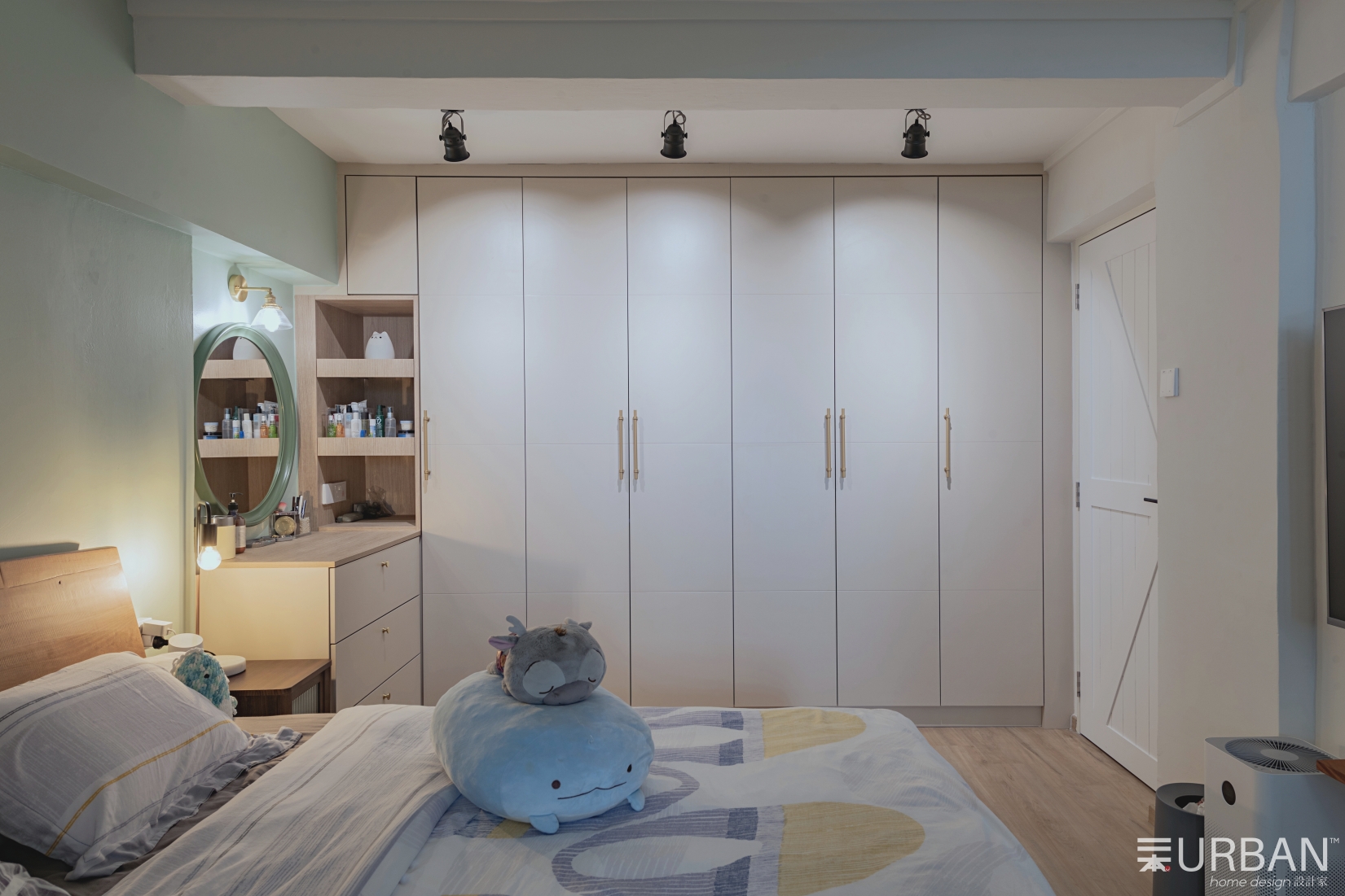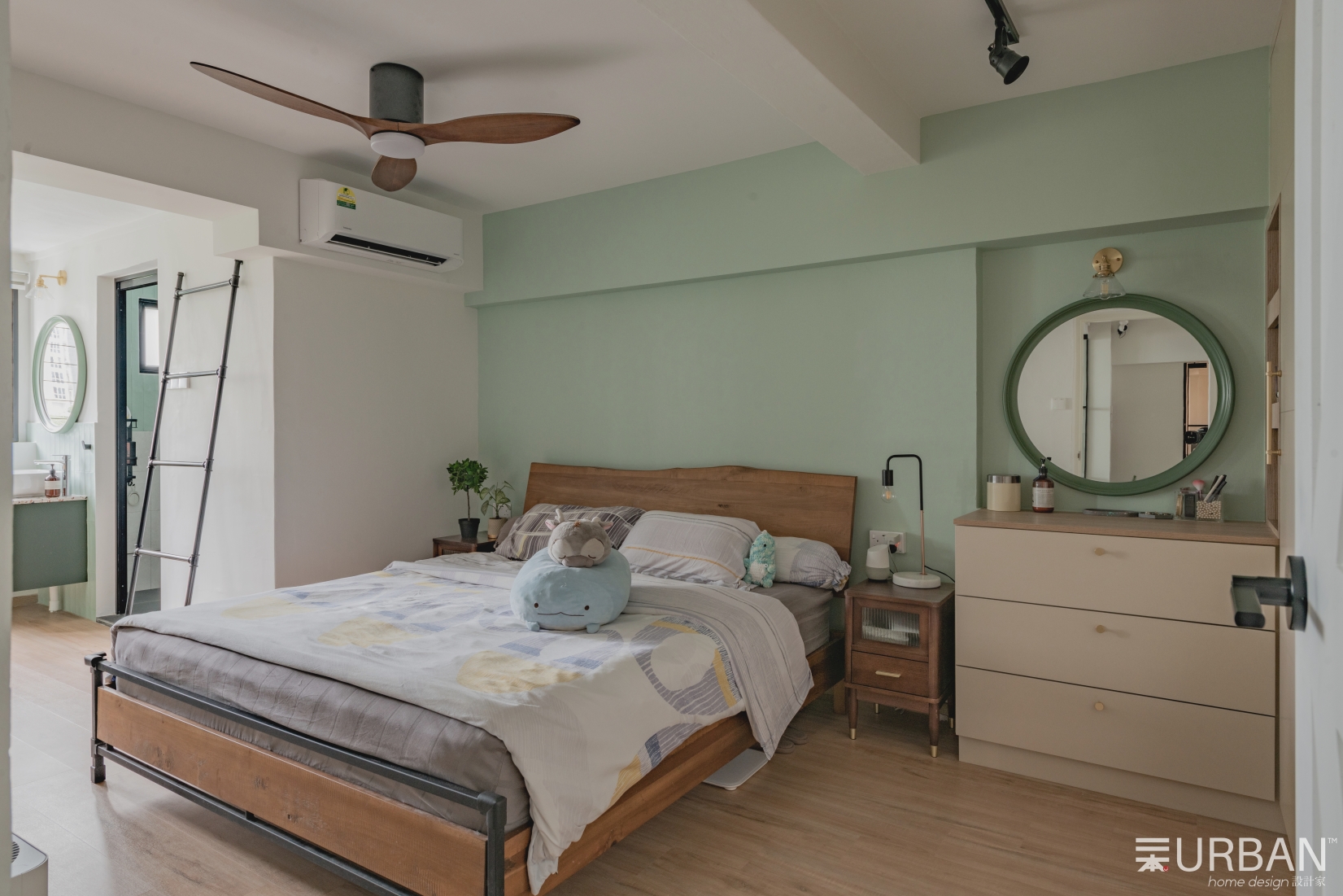 The bedroom continues the soft, soothing theme with a pale green accent wall and wood furnishings. The space is practical and serene, with a focus on comfort. A ceiling fan, floating nightstands, and subtle decorative pieces give it a relaxed and inviting vibe. Storage is well integrated, ensuring that the room remains uncluttered.