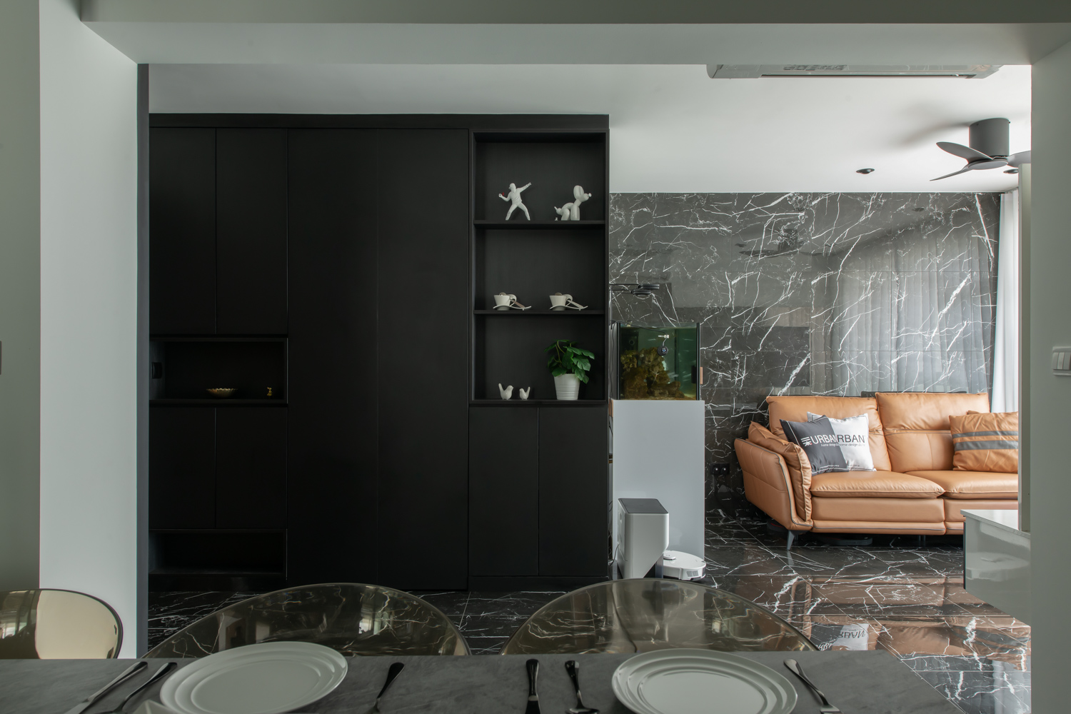 From the moment you walk into the open-concept living and dining area, you’re met with a dramatic black-on-black palette. Glossy black marble flooring with white veining sets a luxurious tone and continues as a feature wall behind the warm leather sofa—a key focal point that adds just the right amount of contrast and comfort. Built-in cabinetry in matte black adds sleek functionality, while the soft spotlight shelving subtly highlights curated decor without overwhelming the space.