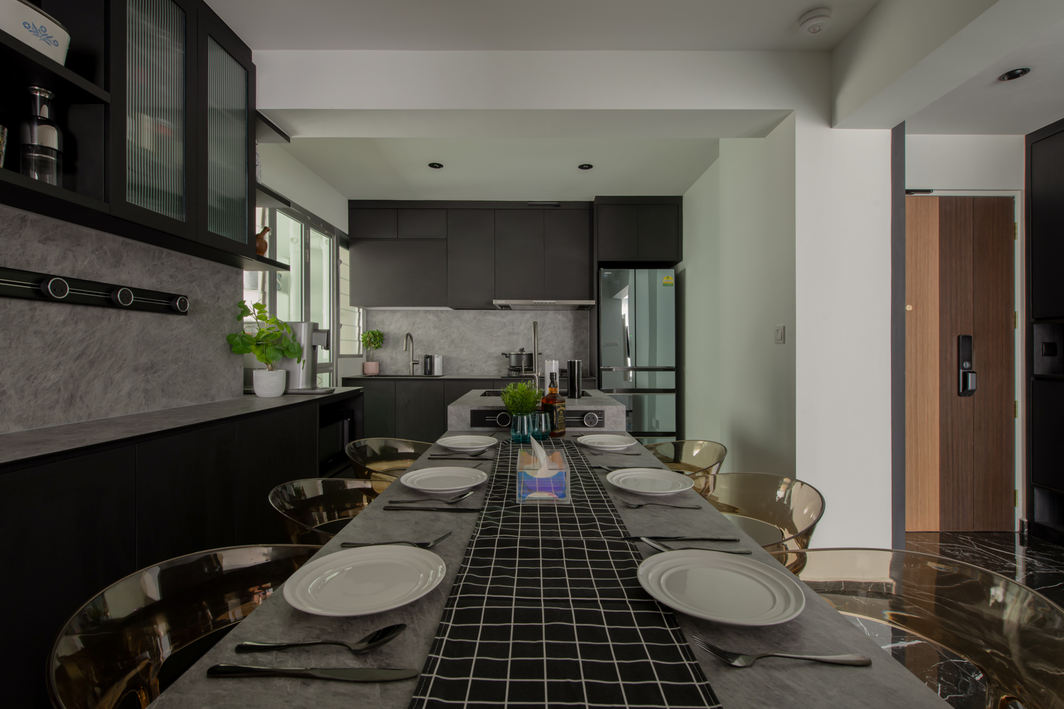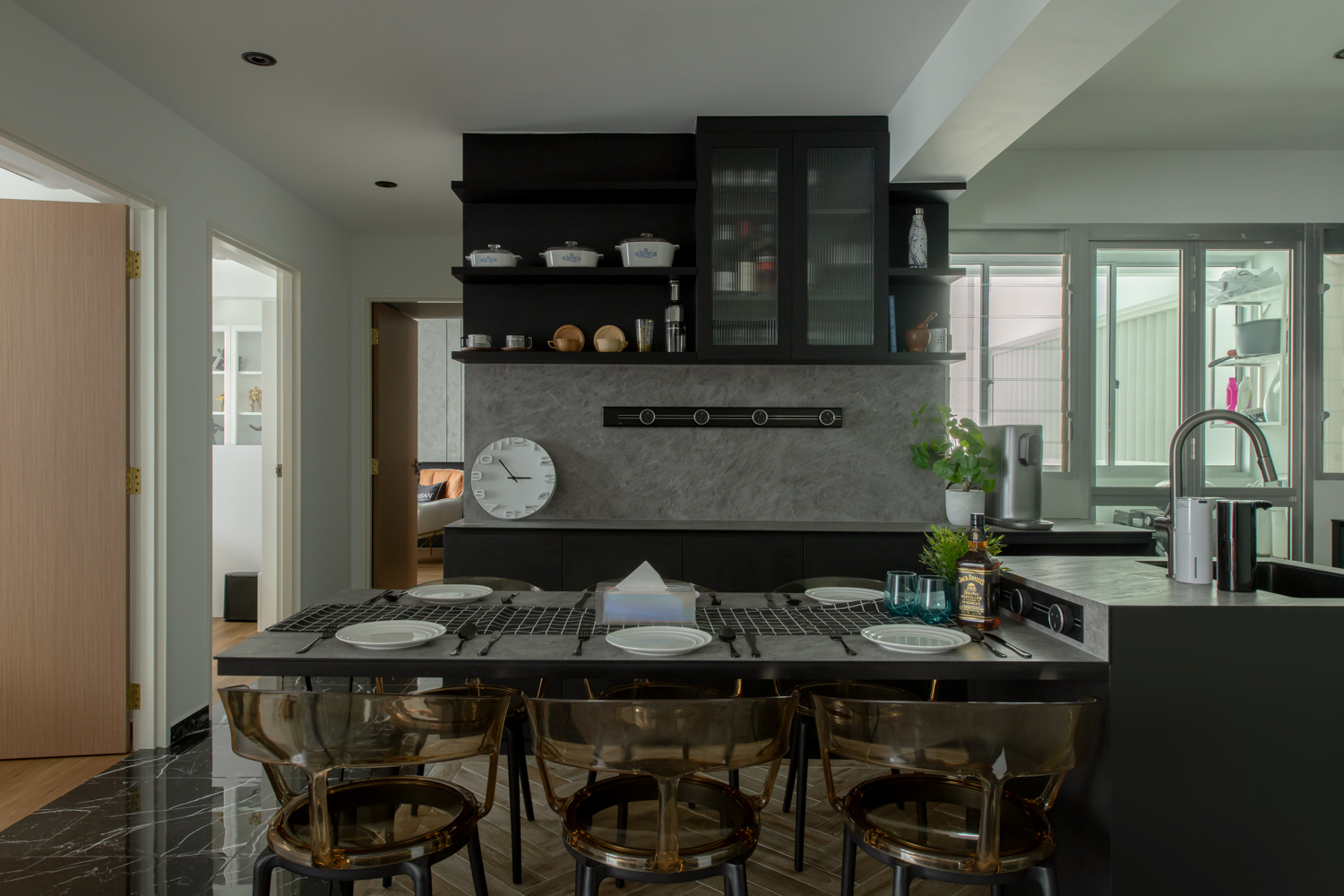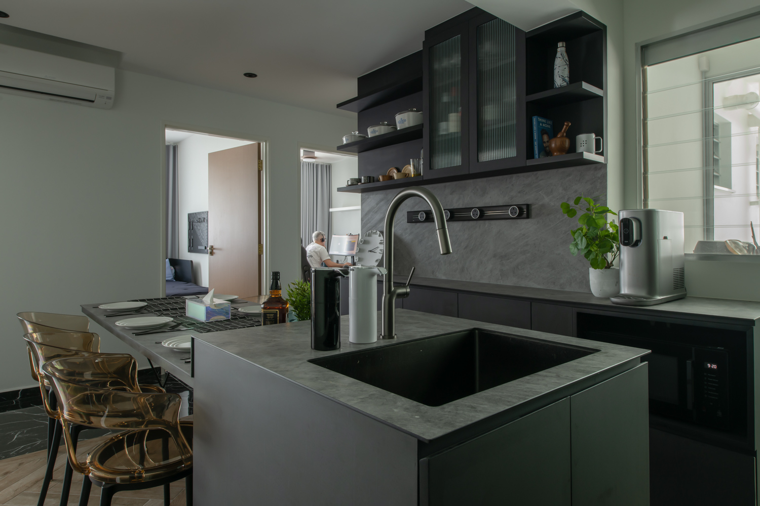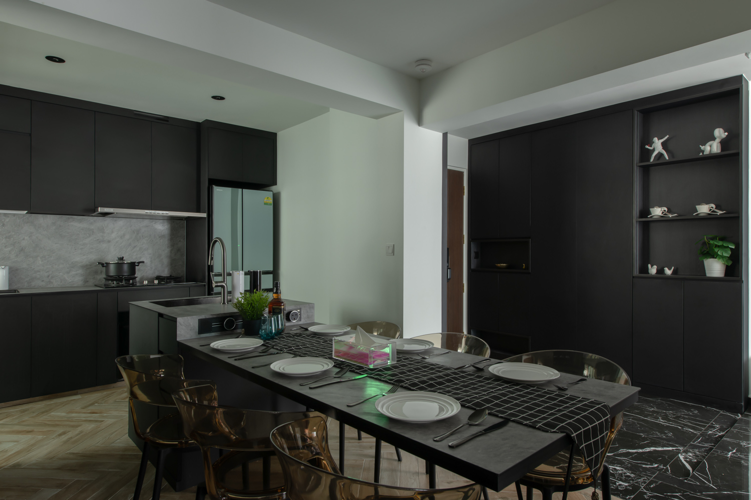 The dining and kitchen area flows seamlessly with the same dark sophistication. A long island doubles as a dining table, framed by transparent bar stools that visually lighten the space. The kitchen is designed with maximum efficiency in mind, featuring handle-less matte cabinets, dark countertops, and open shelving for everyday essentials. Soft under-cabinet lighting casts a warm glow against the stone-textured backsplash, making the space feel cozy yet refined. A secondary island with a deep black sink and minimalist tapware anchors the kitchen zone—blending both style and utility.