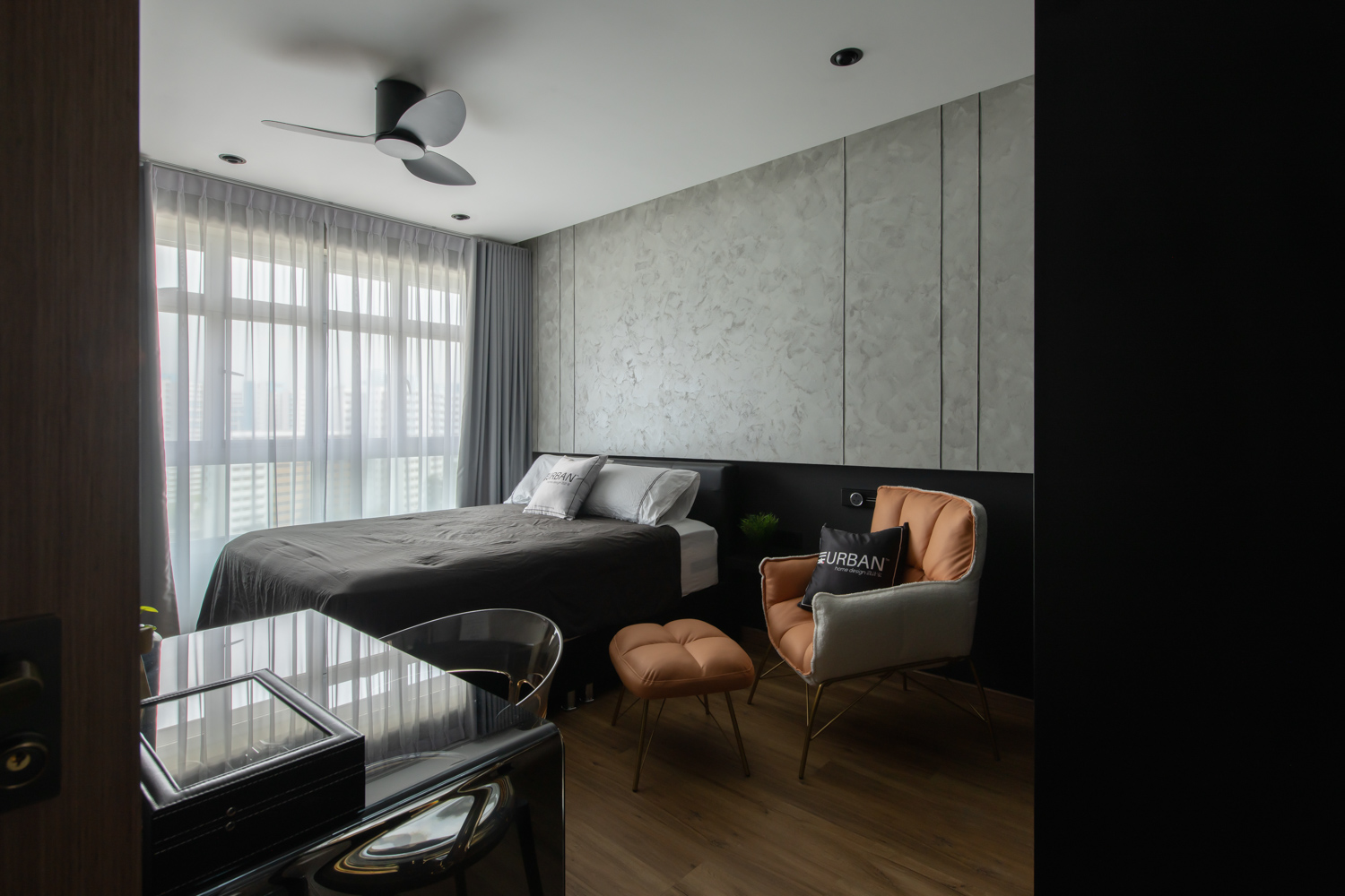 In the bedroom, the mood continues with a more relaxed but still bold vibe. The black built-ins are balanced by warm wood flooring and a soft grey concrete-textured feature wall that brings in a subtle industrial touch. Floor-to-ceiling curtains let in plenty of natural light, softening the overall space and keeping the dark palette from feeling too heavy. Accents like the tan lounge chair and minimal art give the room a modern, hotel-like quality—chic, calm, and incredibly livable.